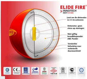 ELIDE FIRE is gecertificeerd door tal van internationale certificeringsinstanties, wat de naleving van strenge veiligheids- en kwaliteitsnormen garandeert en de conformiteit van het product met EU-voorschriften verzekert.